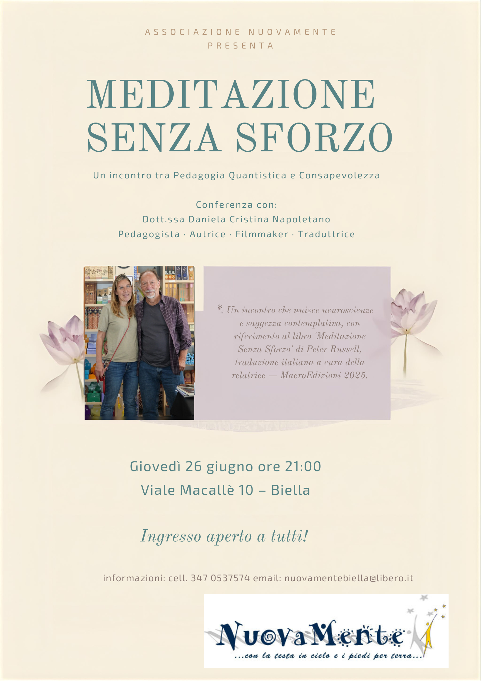 La Dott.ssa Daniela Cristina Napoletano, pedagogista e fondatrice del primo magazine italiano dedicato alla Pedagogia Quantistica, accompagnerà i partecipanti in un viaggio che integra le più avanzate scoperte delle neuroscienze con la saggezza millenaria delle pratiche contemplative, attingendo agli insegnamenti contenuti nel libro “Meditazione Senza Sforzo” di Peter Russell, da lei tradotto per MacroEdizioni (2025).